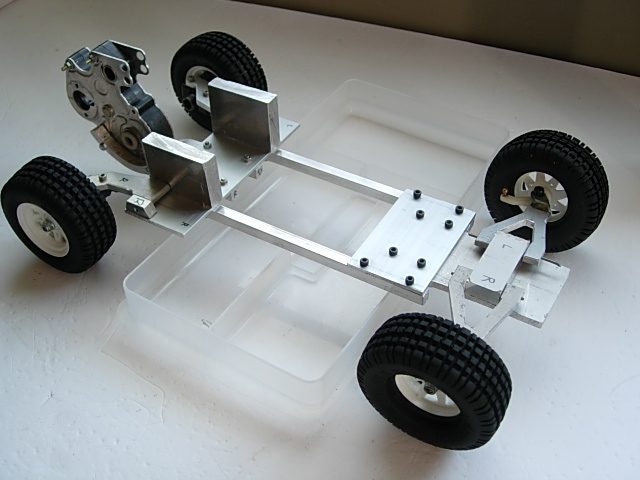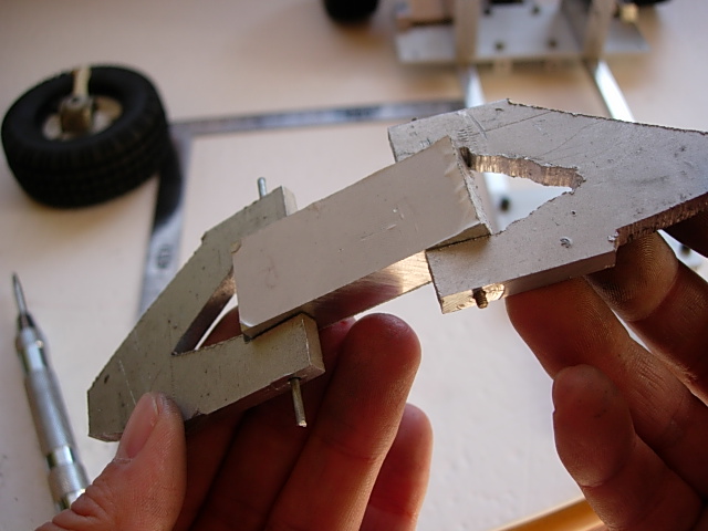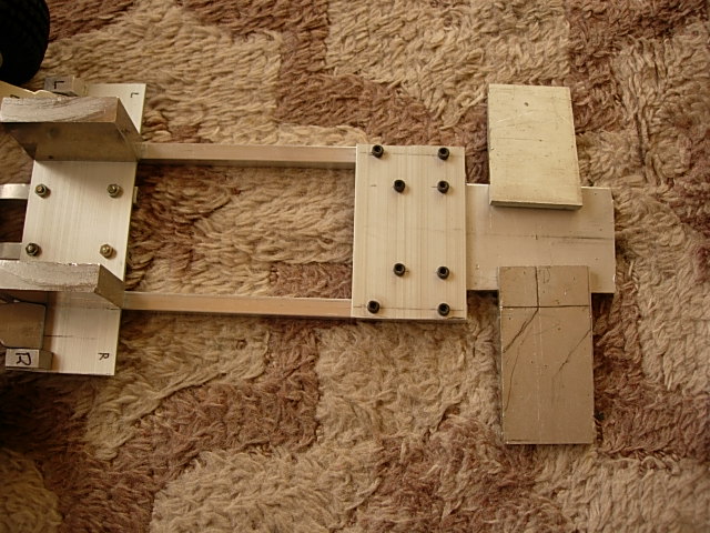 真ん中の角材はシャーシに縫い付けて、A型のサスアームをスイングさせる作戦。