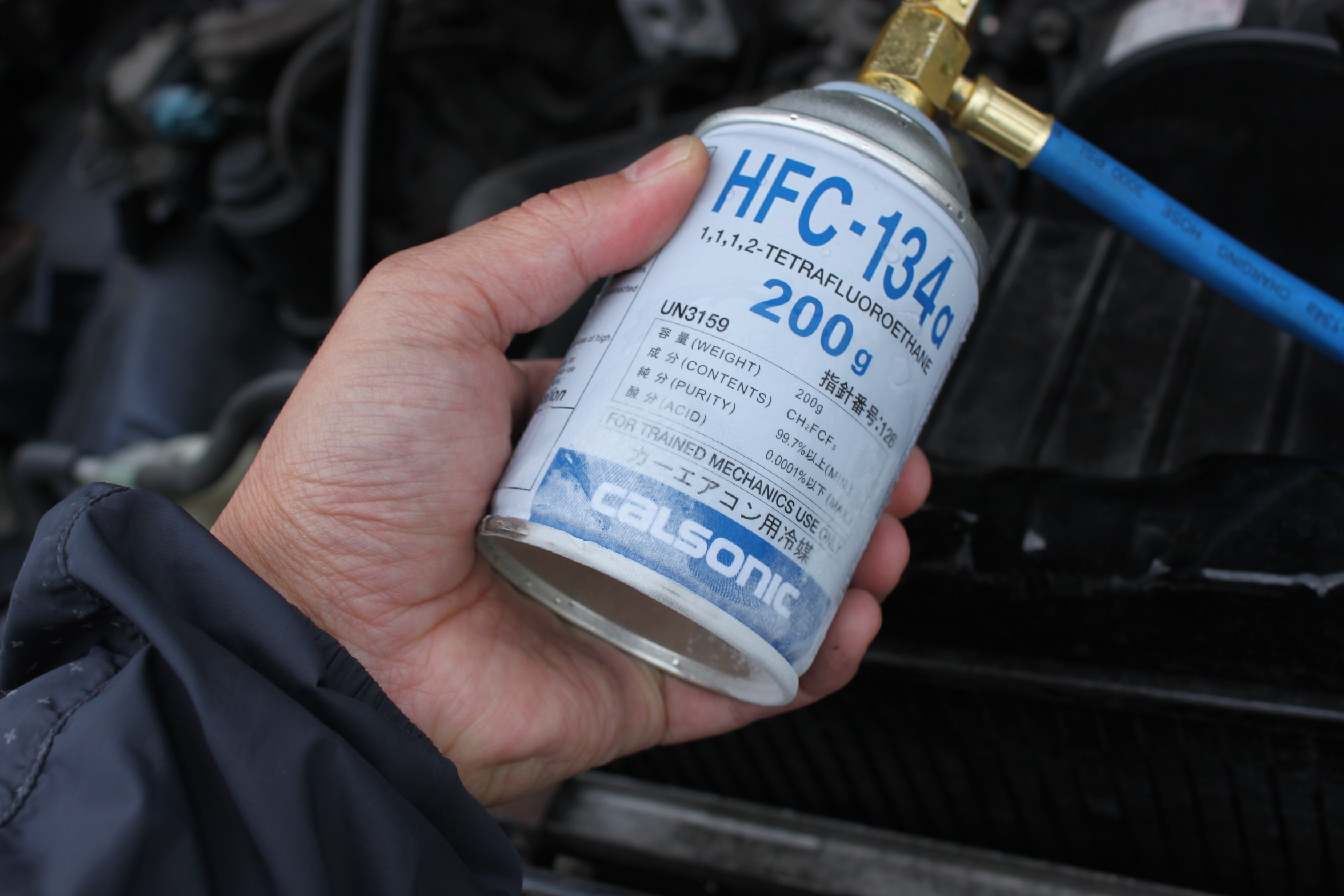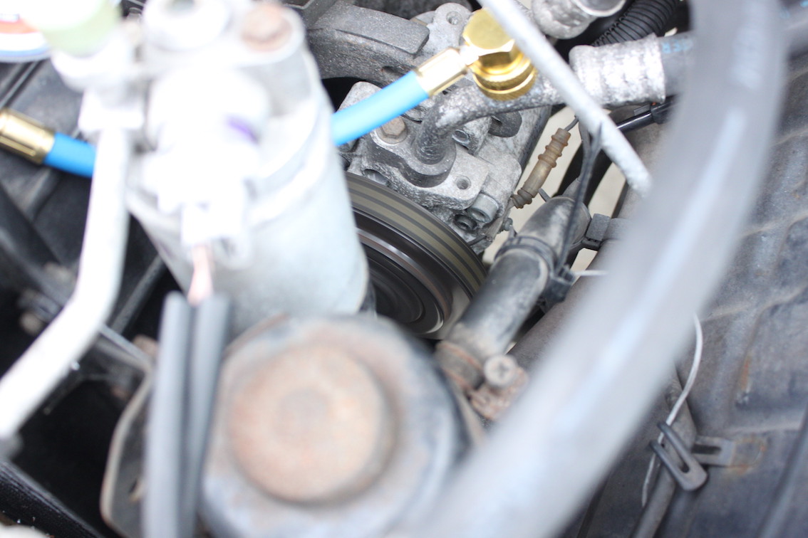 コンプレッサーのバルブにホース取り付けてプシューっとフロンガス注入します