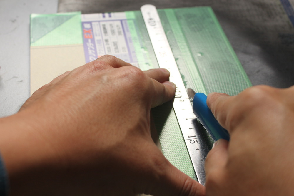 ちなみに、ガイド用の金尺は両面テープで貼り付けてます。